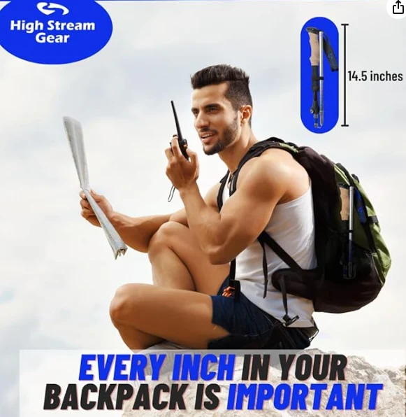 Os postes de caminhada para os Hikiers entram em colapso para 37 cm (14,5 polegadas) e pesam apenas 10 onças, cada um deixando seu lugar para seus itens essenciais e equipamentos pessoais.