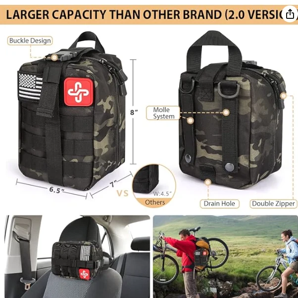 A bolsa de primeiros socorros do Molle Outdoor inclui o total de ferramentas de sobrevivência multiuso. Ele contém os equipamentos e ferramentas de sobrevivência mais populares, também um kit de primeiros socorros que o suficiente para tratar uma família ou um grupo de amigos em circunstâncias de emergência.