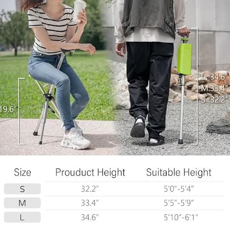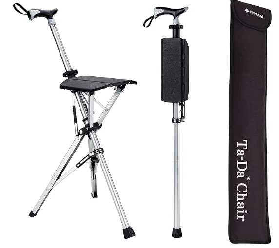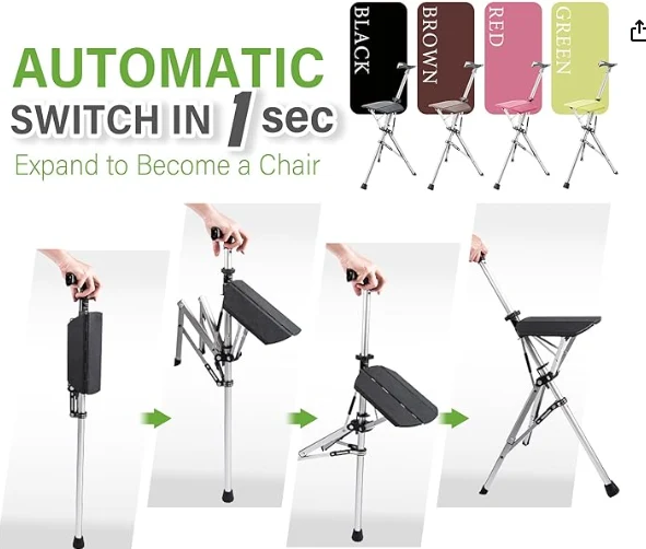 Velhos Alpenstock Trekking bengala, descansando e um bastão para apoio. Esse design, que converte instantaneamente um bastão em uma cadeira com um estalo, oferece descanso para pernas e joelhos cansados a qualquer momento.