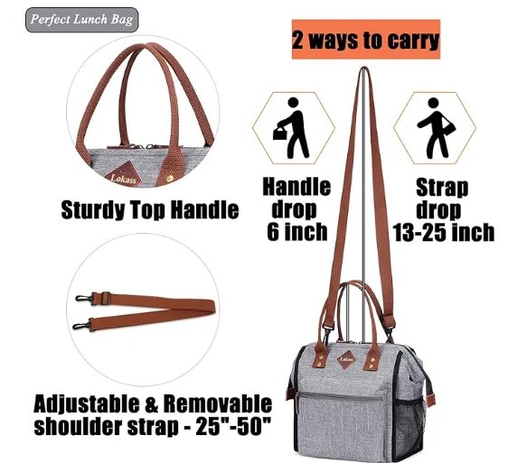 Lunch sagming tem um compartimento principal (10,5 "x6" x12 "), um grande bolso com zíper frontal (8" x7 "x1.5"), um bolso traseiro (9,5 "x6.5") e 2 bolsos de malha lateral. Alças superiores e design de ombro ajustável e removível (25 "-50") para facilitar o transporte.